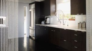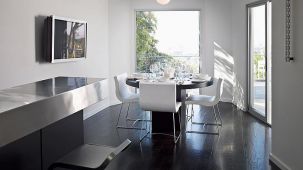 This apartment with nice shades of blue and a beautiful bathroom will help you to relax after work.